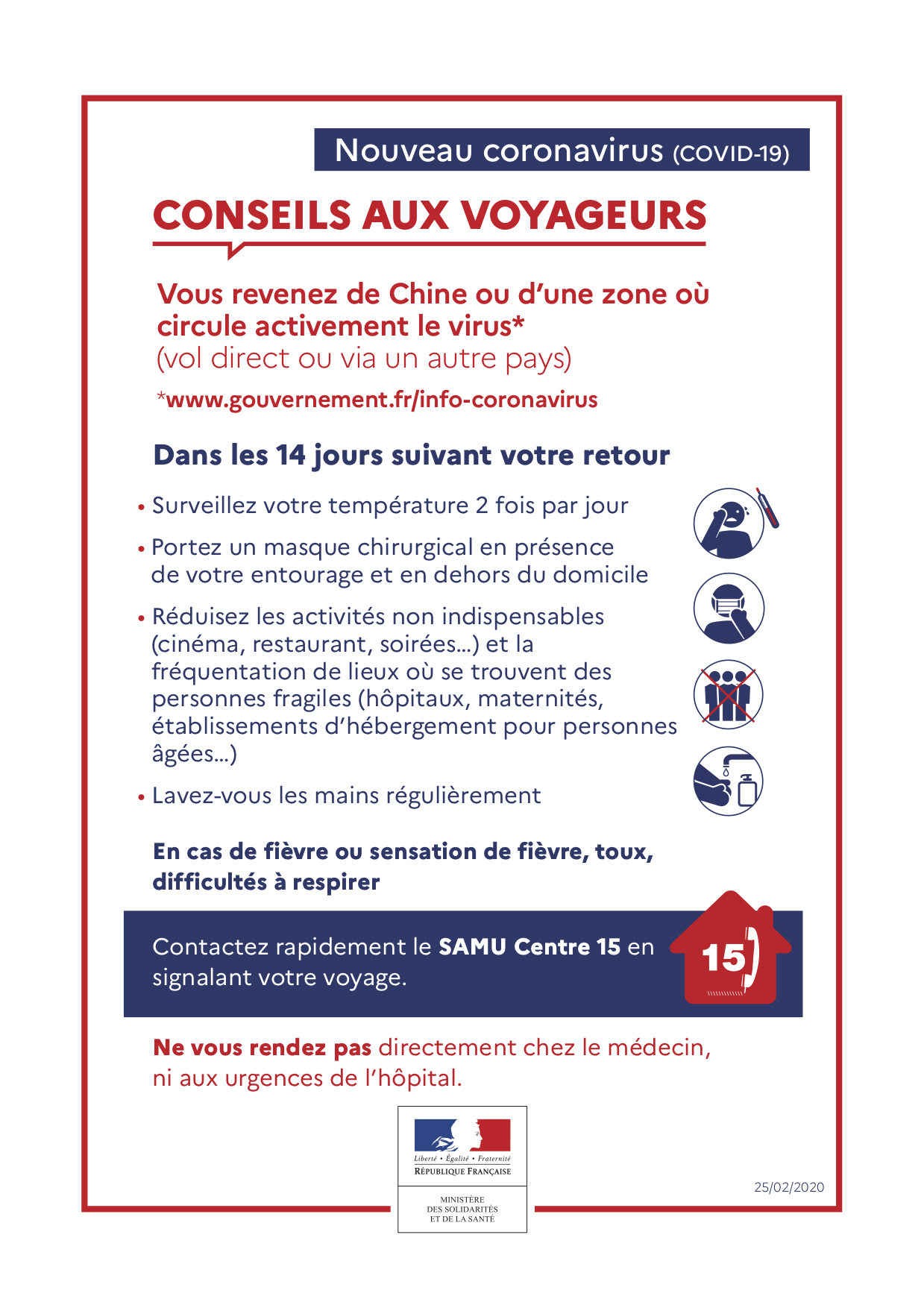Compte tenu du caractère très évolutif de l’épidémie de COVID-19, nous vous demandons de suivre les recommandations suivantes pour les personnes de retour de zone d’exposition: Chine, Singapour, Corée du sud, Iran et les deux régions du nord de l’Italie, la lombardie et la Vénitie.